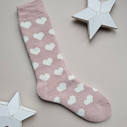 Help keep your feet toastie warm with these super soft and snuggly wool blend long wellington boot socks in pink, with a hearts design.