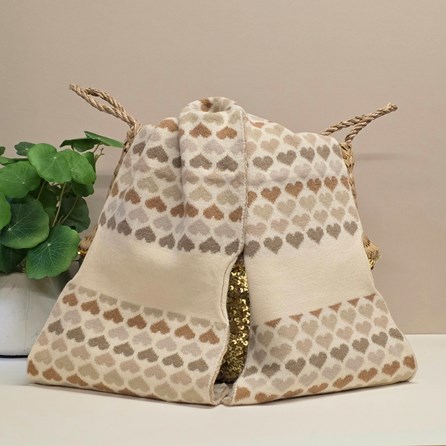 This super soft pull-through taupe scarf has a delicate hearts design. Perfect to put on to keep you snug when there's a chill in the air.
