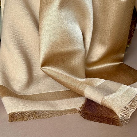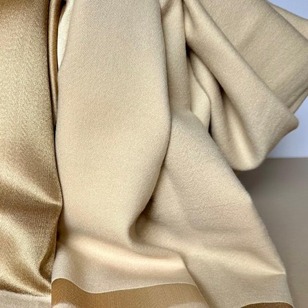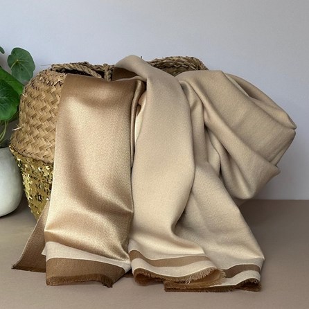 This soft and silky beige and gold border reversible scarf is perfect to wrap yourself in on cooler days and nights.